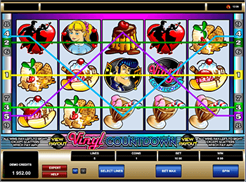 Слот-машина Vinyl Countdown – игровой автомат о неповторимых шестидесятых годах. Эмулятор поможет игрокам окунуться в ту атмосферу за счет удачно подобранных символов – изображения Элвиса, милой девушки, танцующей пары, стильных туфлей тех годов и различных сладостей: бананов с мороженным, вафлей, карамельного десерта и коктейля.